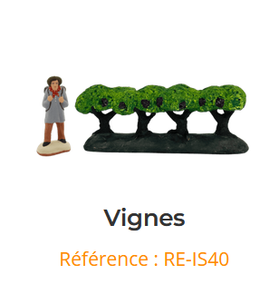 Découvrez cette charmante rangée de vignes, un santon de Provence authentique qui capture l'essence rurale de la région. Parfait pour les collectionneurs et les amateurs de décoration provençale, ce santon détaillé apporte une touche de charme méditerranéen à votre intérieur. Idéal pour compléter une crèche ou créer une scène champêtre inspirée des paysages viticoles provençaux. Un véritable trésor artisanal qui raconte l'histoire des traditions provençales.